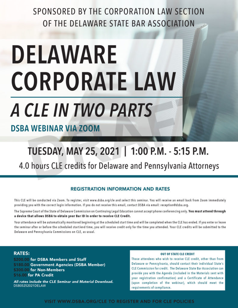 Ellisa Habbart of the Delaware Counsel group is delighted to announce that she will be moderating the upcoming DSBA Webinar Delaware Corporate Law: A CLE In Two Parts on May 25, 2021 at 1:00 PM EST, during which distinguished panelists from both the corporate sector as well as Delaware’s Court of Chancery will discuss issues ranging from the Delaware Courts to the current reality facing directors. If interested you may register here.